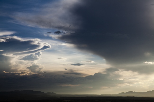 Storm clouds also drifted by in the late afternoons and early evenings. They would loose a few raindrops, sail on out over the town, and then soak the plateau beyond. One night the whole mountain range on the eastern horizon was lit by lightning, striking the mountaintops in fiery lines over and over, with a flickering veil of heat lightning as a backdrop. It was so far away you never heard a sound, no rumble of thunder, not even a mutter.